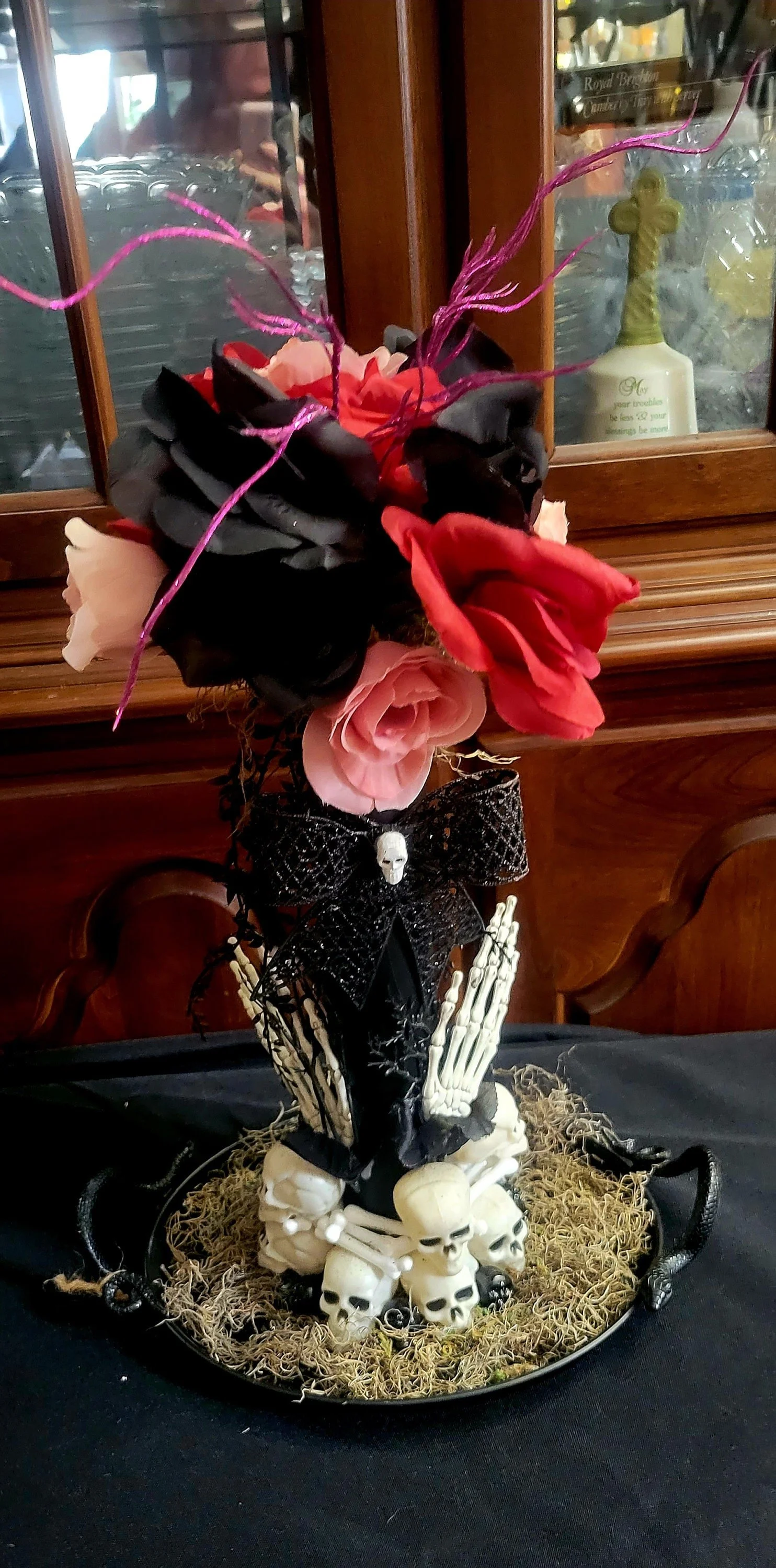 Spooky Halloween Centerpiece, Black and Red Roses, Creepy Moss Decor, Skull Embellishments, Snake Handle Tray, Black Vase Decoration, Eerie Elegant Decor, Halloween Floral Centerpiece, Sinister Bloom