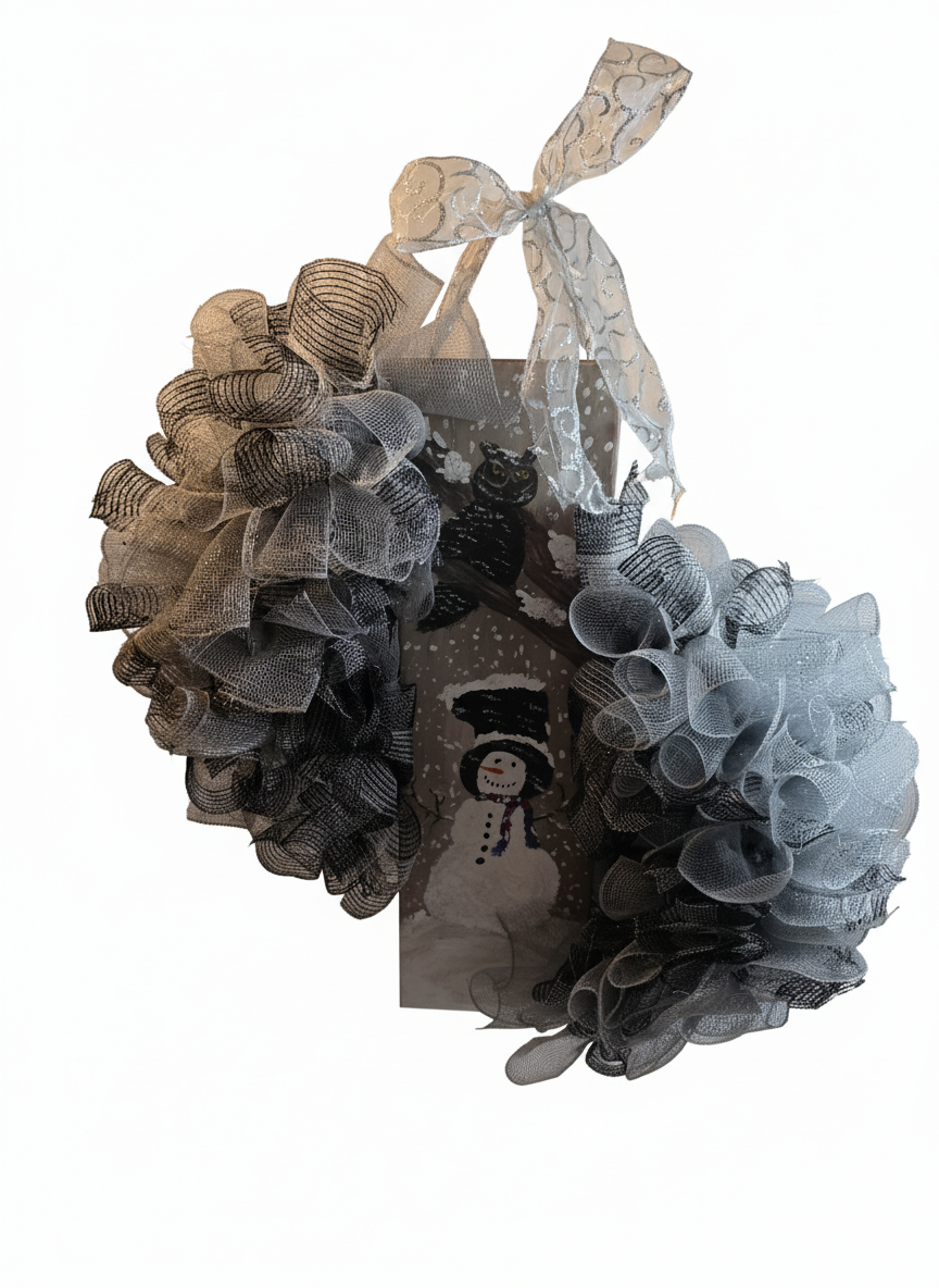 The Twilight Evergreen wreath blends nature and holiday elegance in perfect balance. Featuring a painted green grapevine base, frosted pinecones, red ornaments, and a layered white-and-holly bow with a gold-tied gift box, this 18” wreath captures the calm beauty of winter twilight. Designed for indoor or covered outdoor use. Each wreath is unique due to its handcrafted nature.